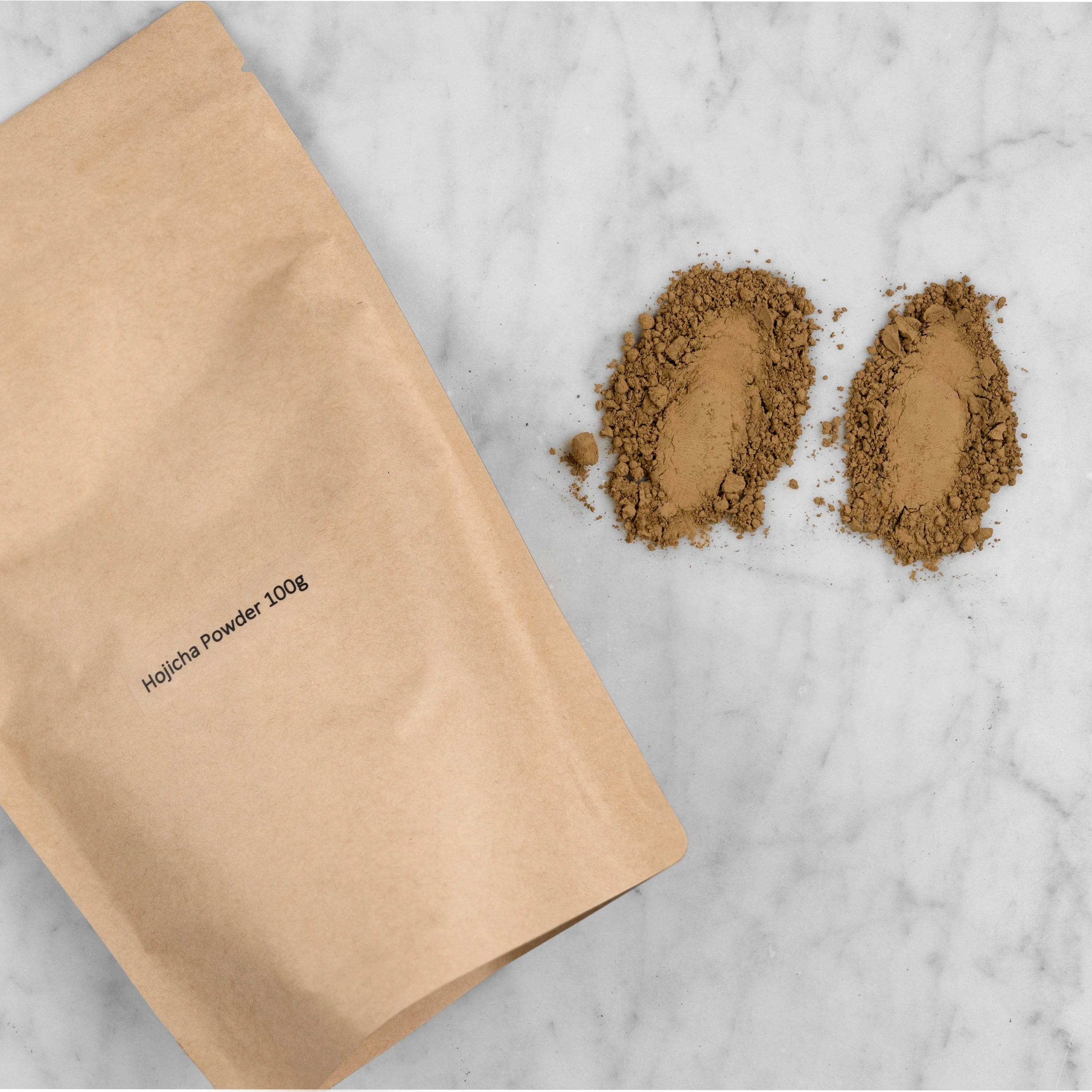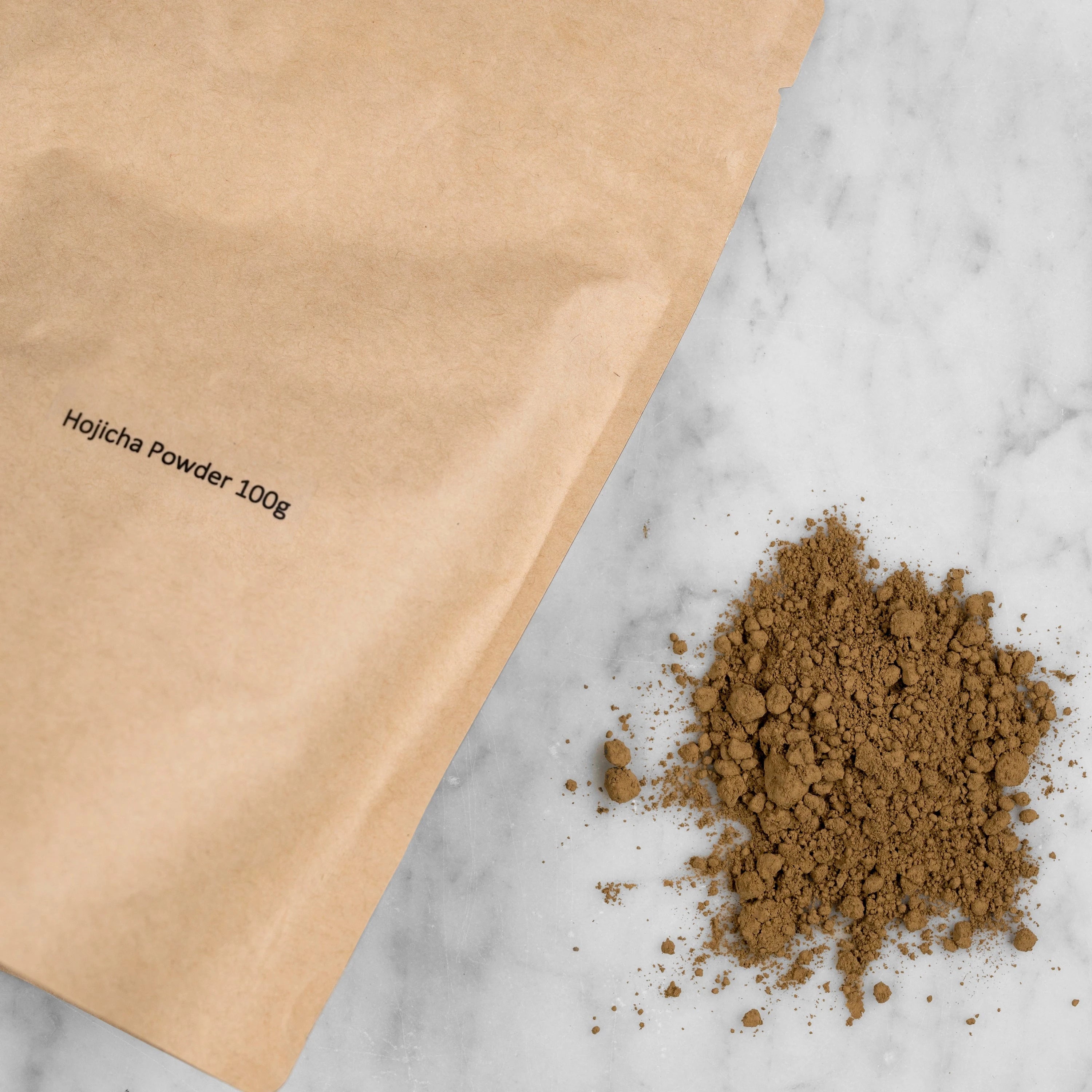 Hojicha Powder packaging and pile of ground tea. The hojicha powder comes in a kraft pouch with a label reading: Hojicha Powder 100g. Next to the pouch is a pile of ground roasted green tea. It appears brown in color and is finely ground.